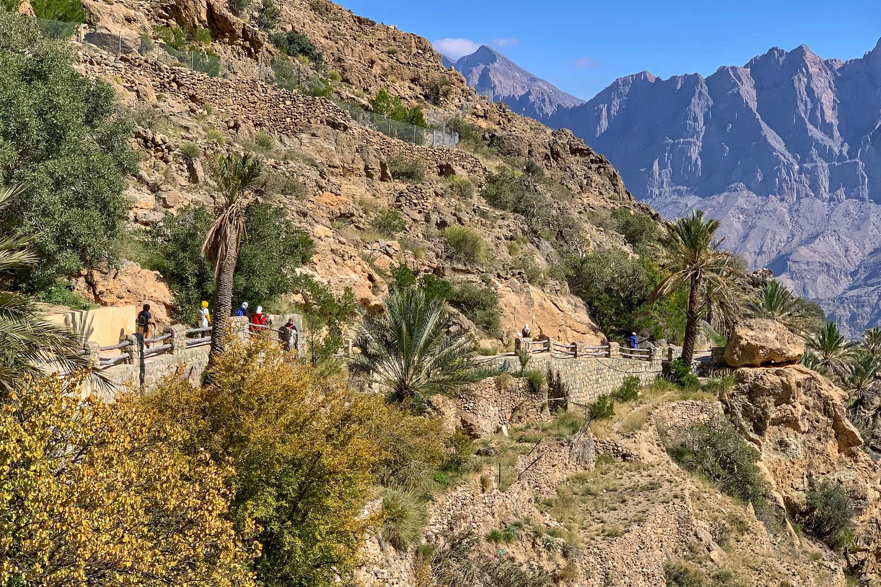We start our hike from the village of Hadash making our way up the mountain 1400 meter to Qarn Hadash (The Horn of Hadash) with spectacular views over the basin of Wadi Mustal. After continuing a bit further we get to see the village of Saih Qatna of Al Jabel Al Akhdar. A little further takes us to Qarn Wakan (The Horn of Wakan) with magical views of the village from above. Making our way through the lush greenery and fresh water through the village.