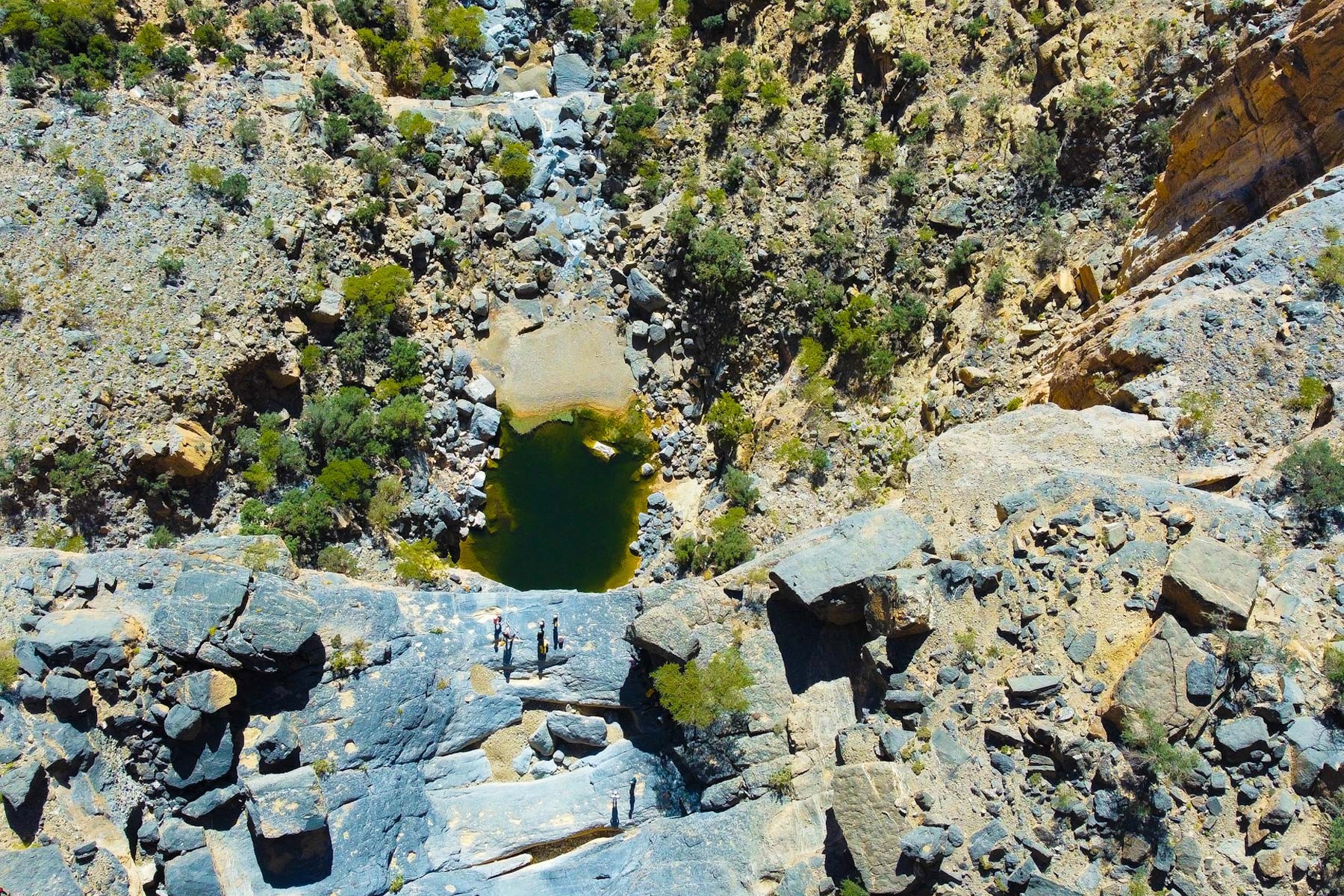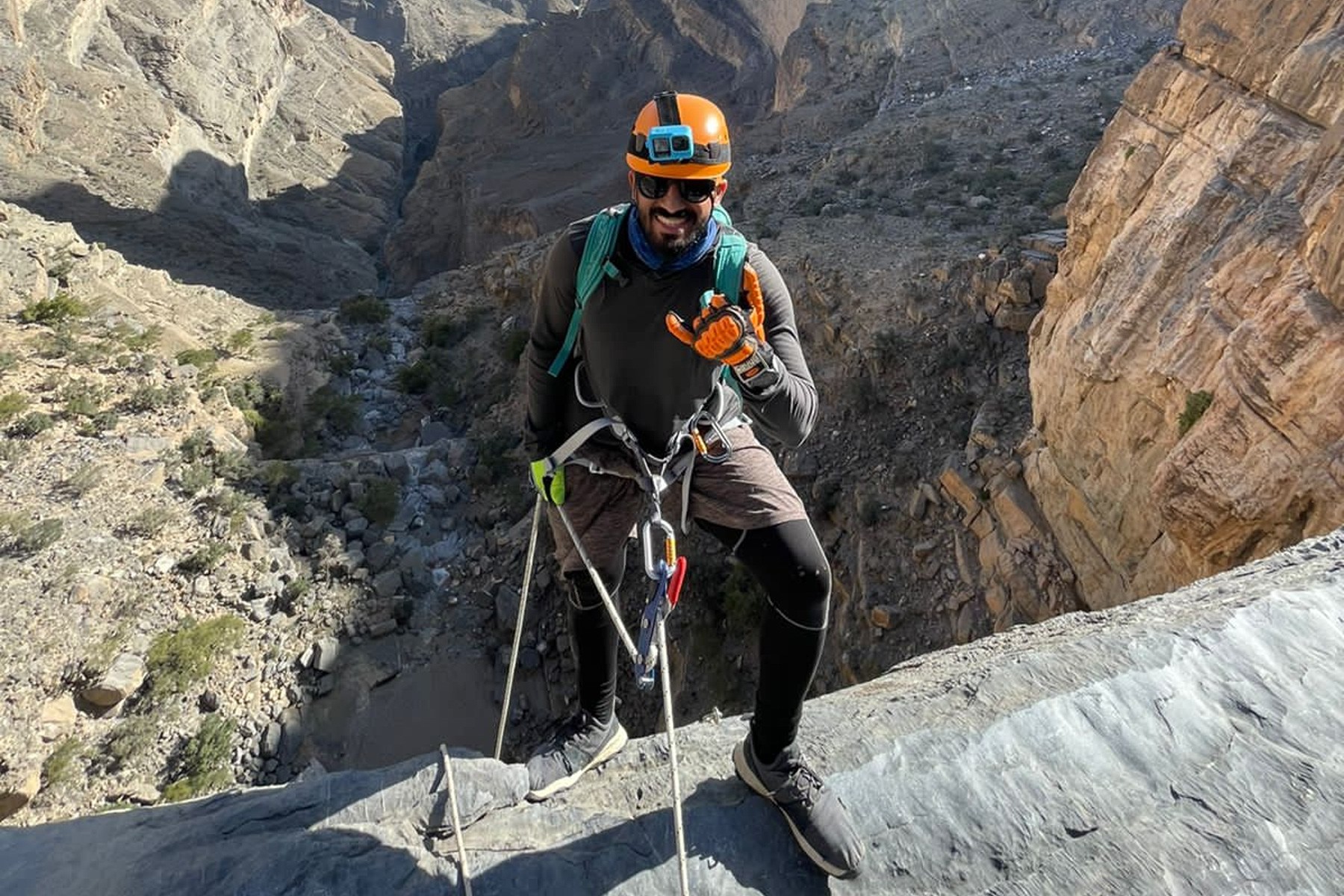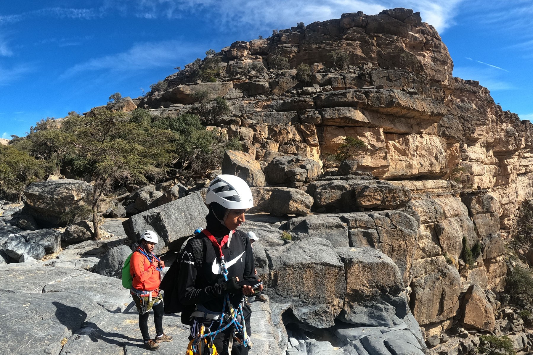 We will start the adventure at the top of Jabel Shams with a short hike to the via Feratta. We will go down one stage of the via Feratta and make our way to the 150 meter drop. After abseiling down the longest abseil in Oman we will go to the hidden pool to enjoy the place & have a break. Then we will hike about 200 meters up back to to the via Ferrata to climb up 400 meters back to the cars which is 1 km after the climb.