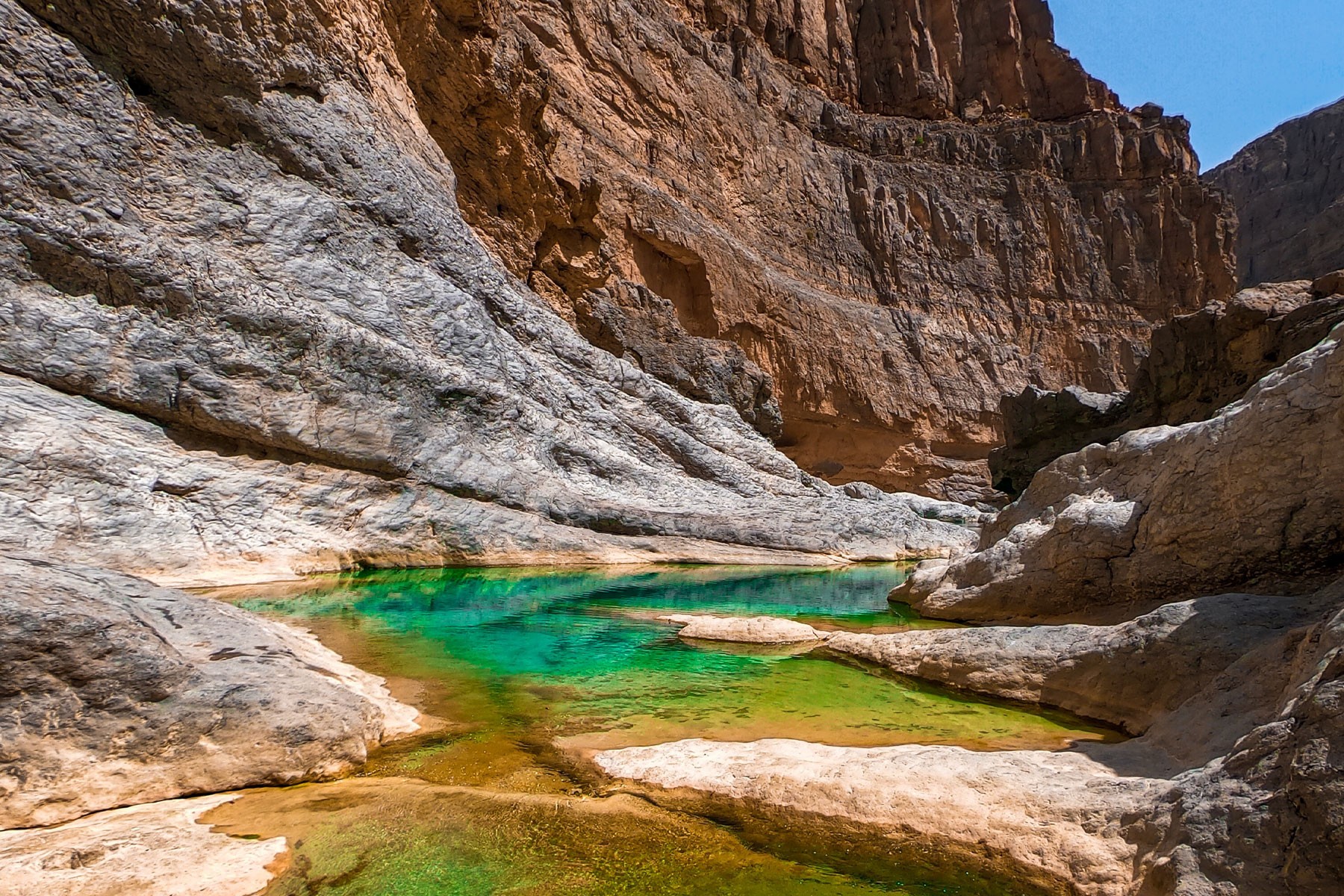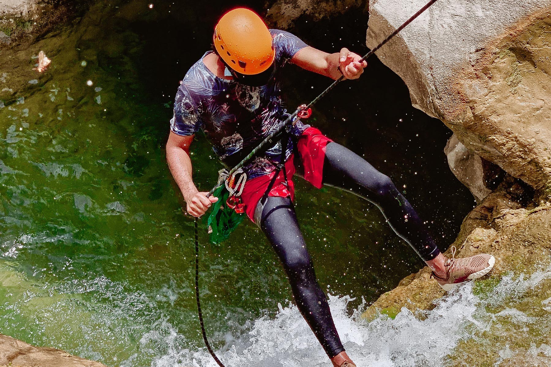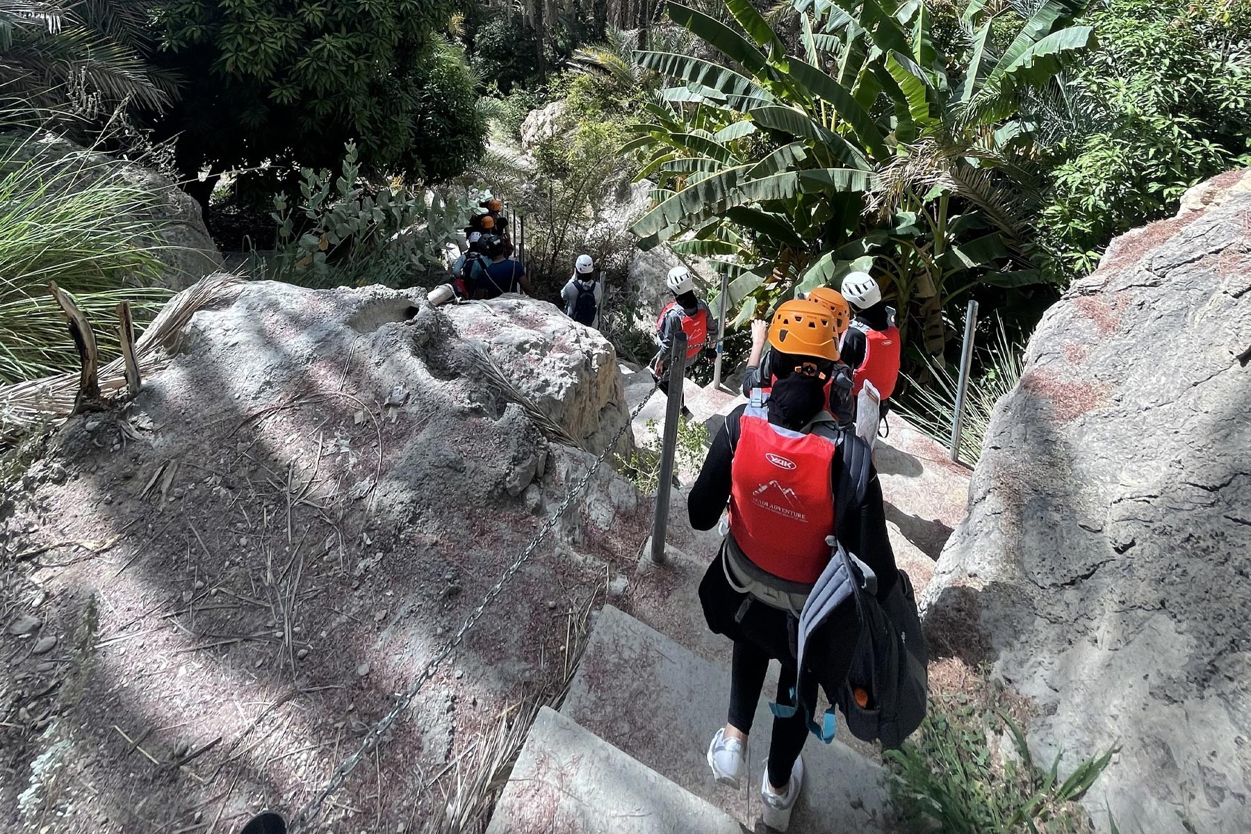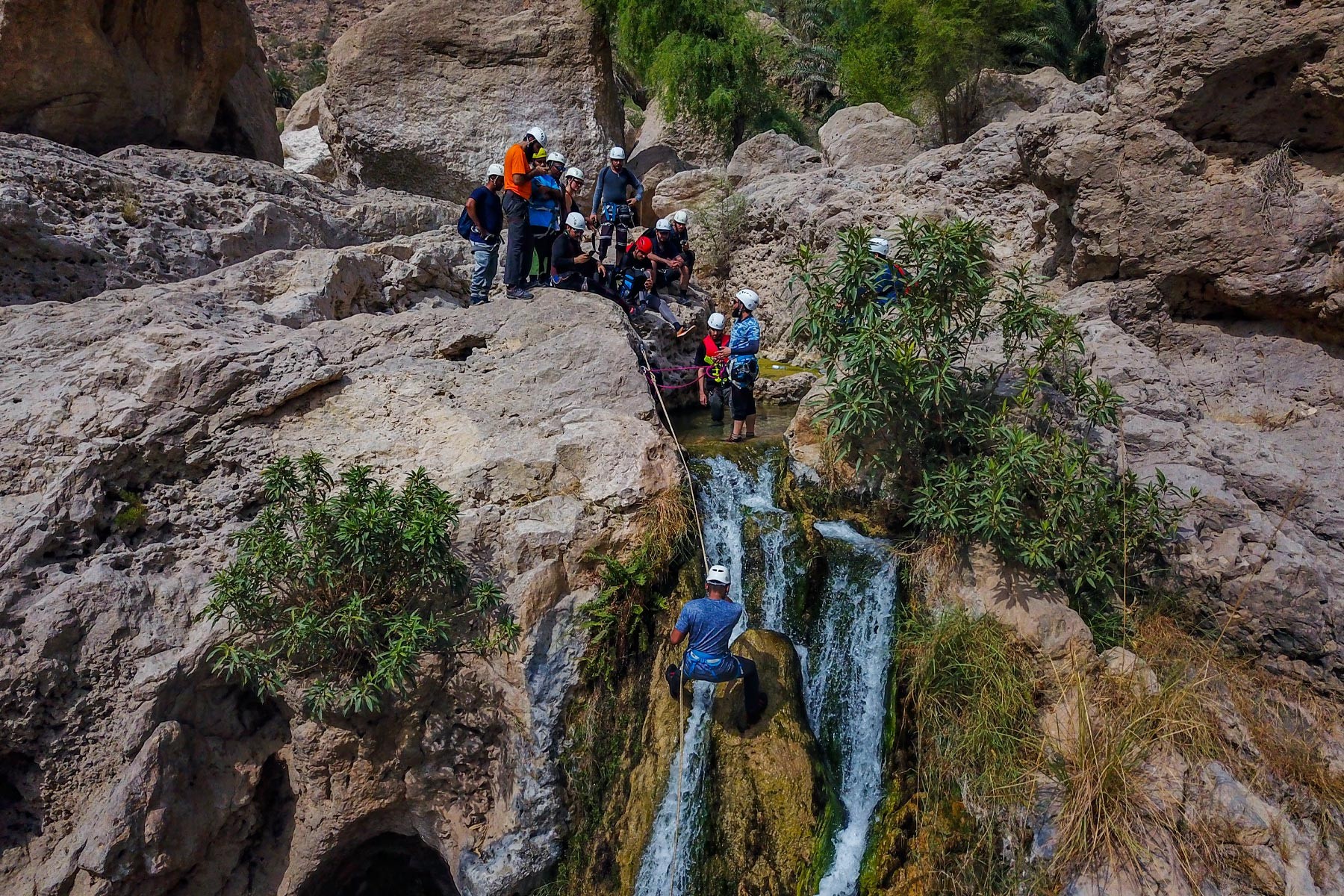 We will take the roads between the mountains passing through many farms and spectacular views to the start of our adventure in the village of Mibam. We will then hike our way through the charming village which has old stone houses and green lush farms. Once we get to the waterfalls, we will abseil 15 meters followed by a second abseil of 7 meters, that will take us to the beautiful lakes of Wadi Mibam. Here we will swim about 50 meters in an area that will make you forget where you are. We will take a break here and enjoy the swim. Try taking in the beauty of the clear water, lush greenery and huge valley. After that we will make our way up the farms to our cars.