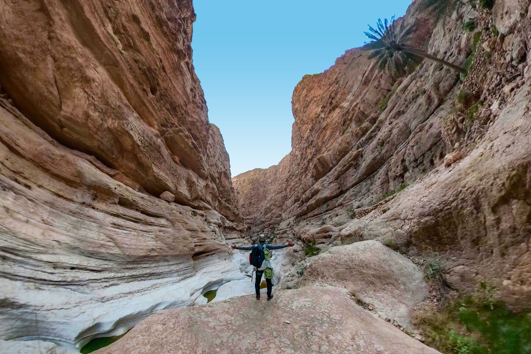 We begin the adventure at the village of Umq Beer at an altitude of 900 meters at the source of Wadi Tiwi. The hike includes countless water pools, a couple of abseils and entering the majestic cave of the wadi. Swimming compromises about 80% of this adventure with various pool distances, as well as hiking, scrambling and jumping until we reach the village of Mibam.