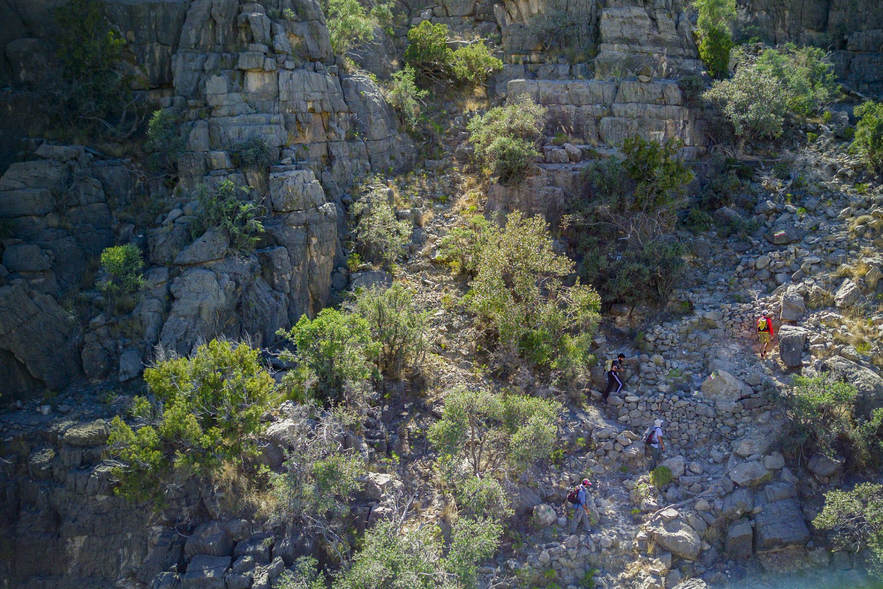We start our hike from the village of Hadash making our way up the mountain 1400 meter to Qarn Hadash (The Horn of Hadash) with spectacular views over the basin of Wadi Mustal. After continuing a bit further we get to see the village of Saih Qatna of Al Jabel Al Akhdar. A little further takes us to Qarn Wakan (The Horn of Wakan) with magical views of the village from above. Making our way through the lush greenery and fresh water through the village.