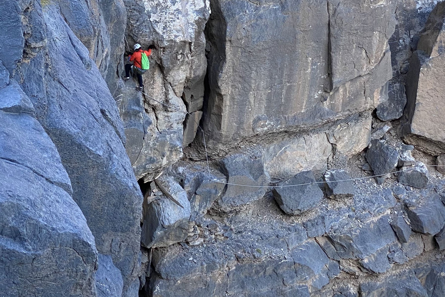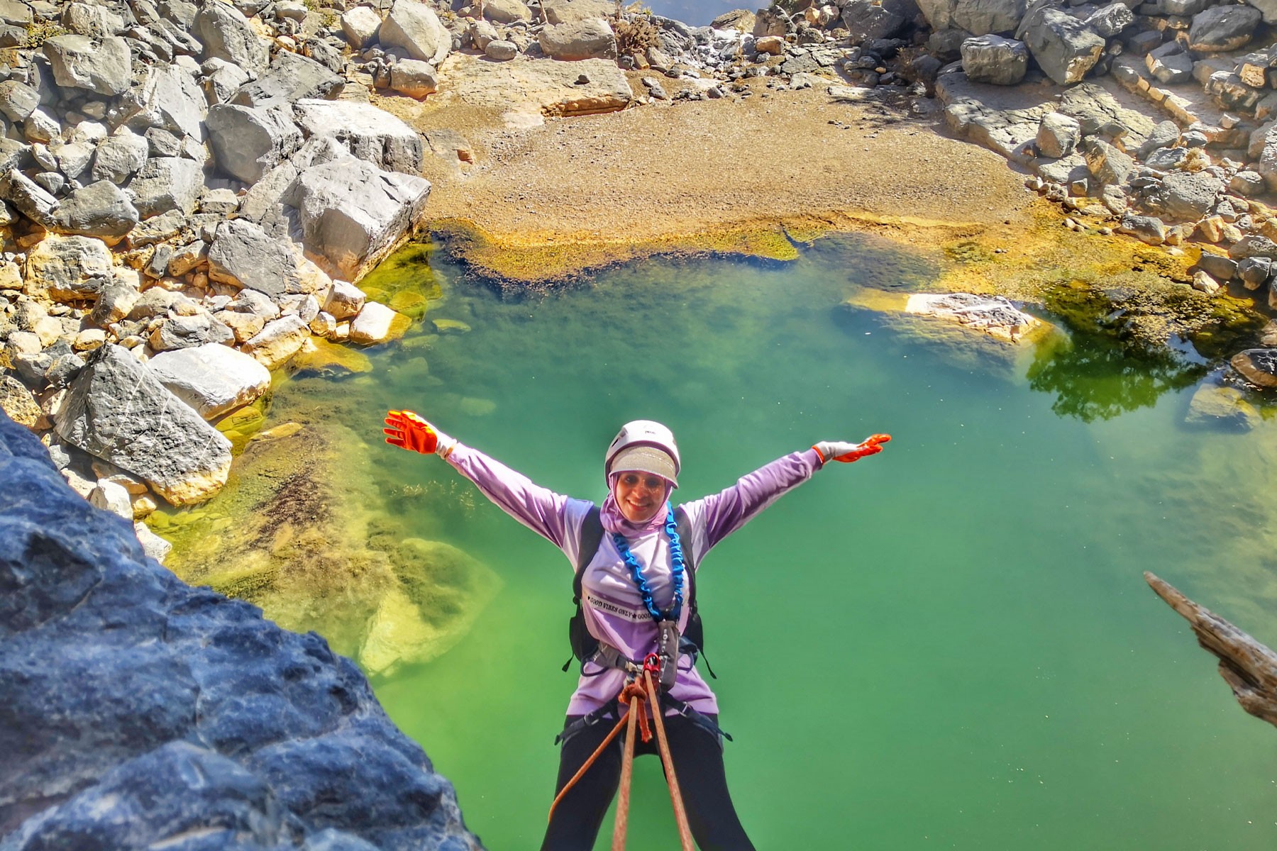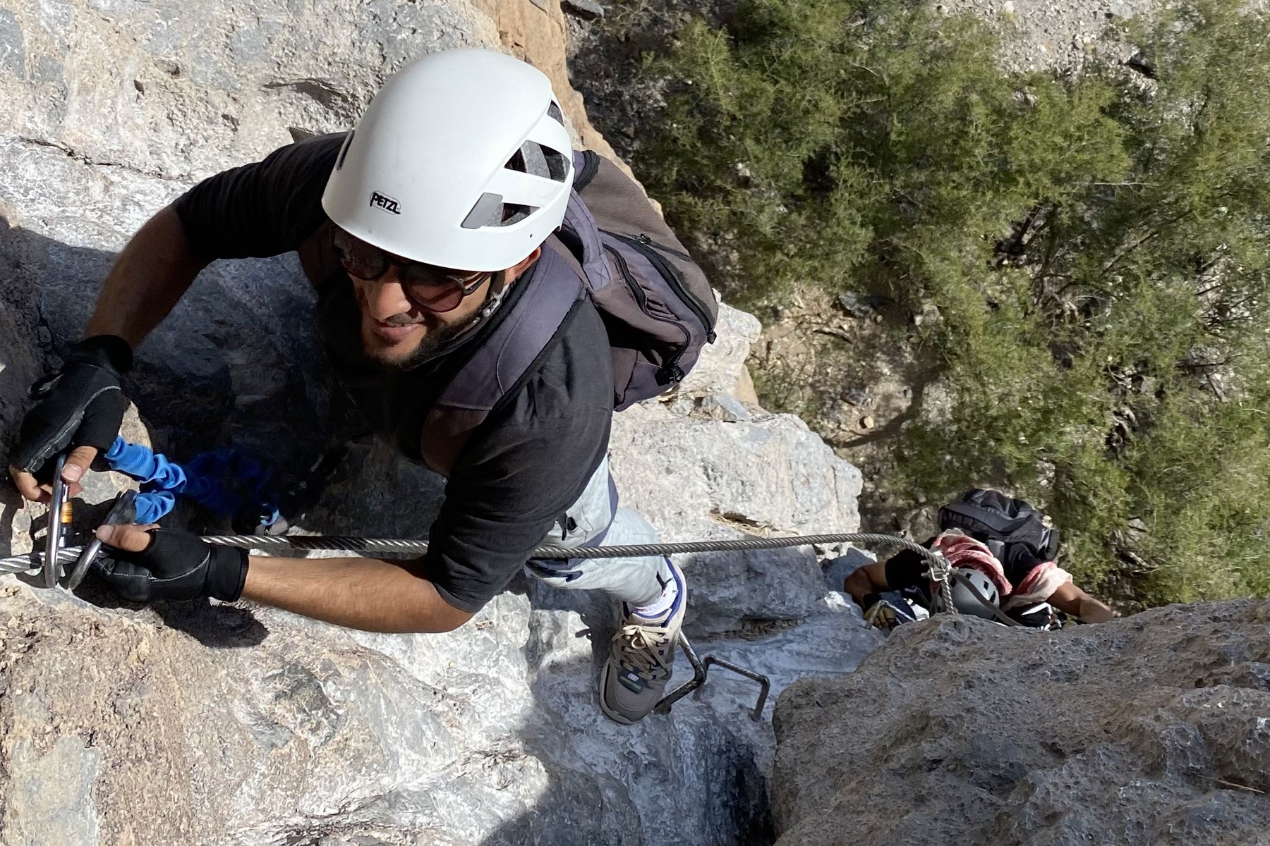We will start the adventure in Jabel Shams from the beginning of Saab Bani Khamis. We will pass by the abandoned village of Saab. From there we will go to the hidden pool to enjoy the place & have a break, we will abseil 20 meters above the pool for whoever is interested & want to challenge his/her fears (optional). Then we will go up 200 meters to the iron way (via Ferrata) to climb up 400 meters back to the cars which is 1 km after the climb.