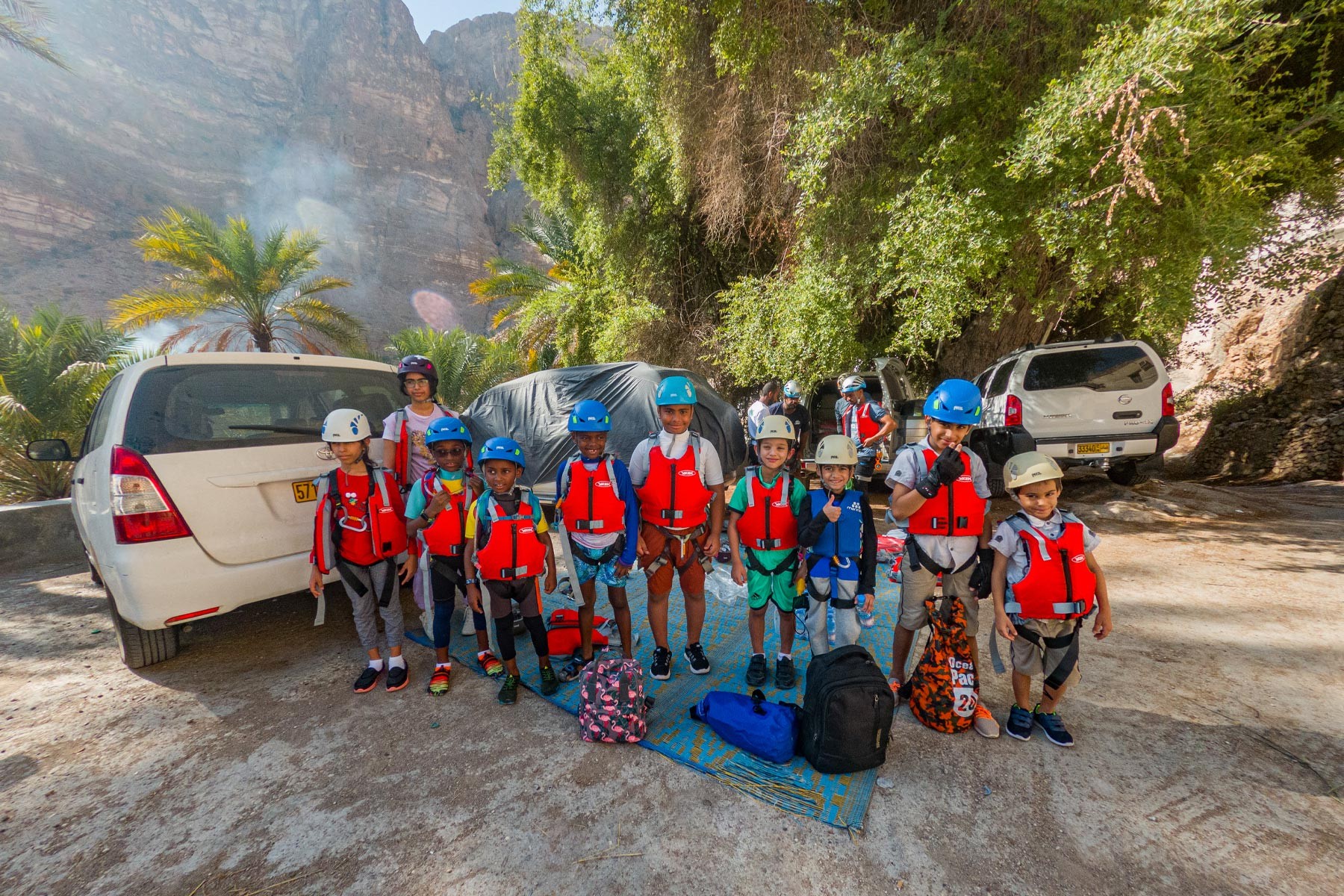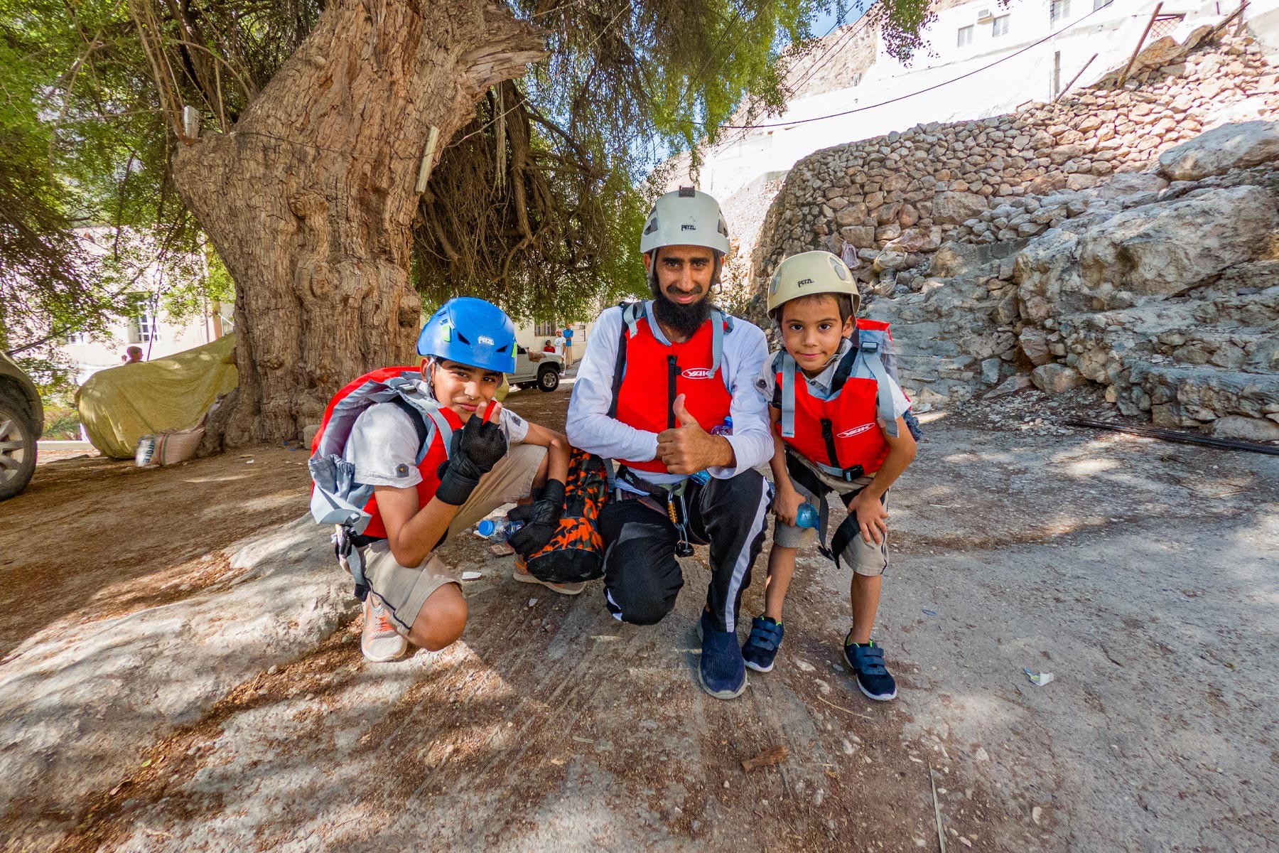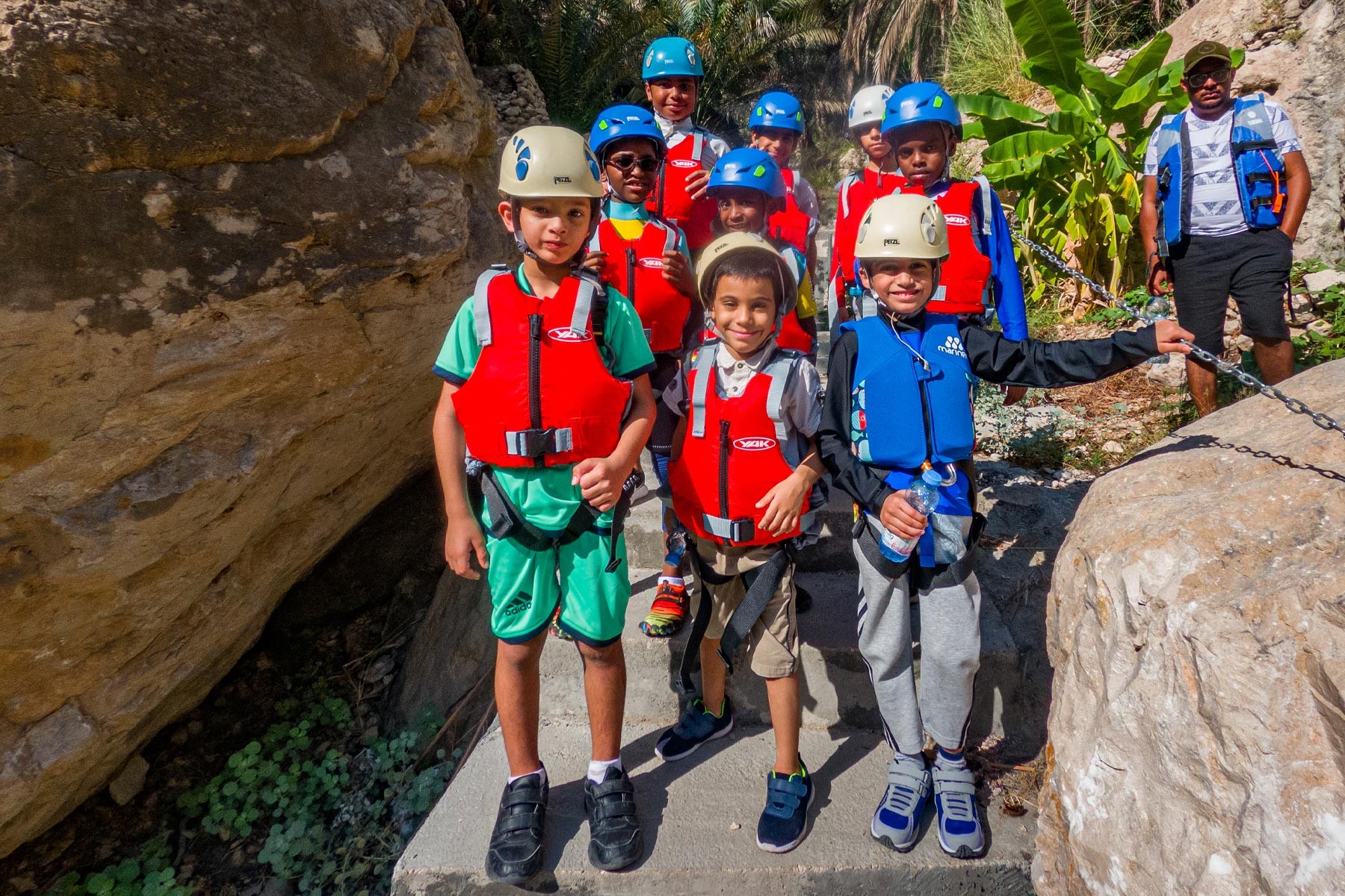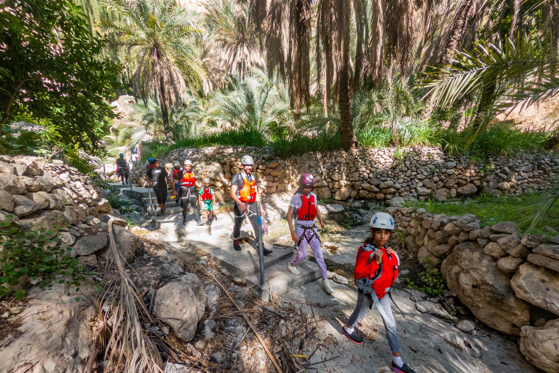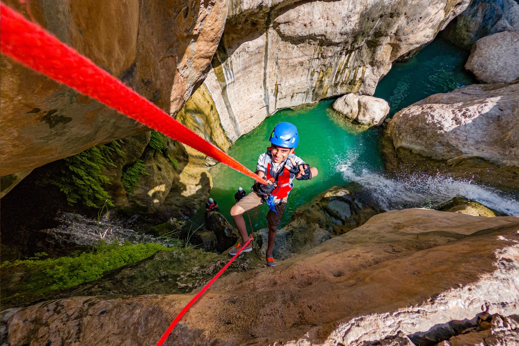 We will take the roads between the mountains passing through many farms and spectacular views to the start of our adventure in the village of Mibam. We will then hike our way through the charming village which has old stone houses and green lush farms. Once we get to the waterfalls, we will abseil 15 meters followed by a second abseil of 7 meters, that will take us to the beautiful lakes of Wadi Mibam. Here we will swim about 50 meters in an area that will make you forget where you are. We will take a break here and enjoy the swim. Try taking in the beauty of the clear water, lush greenery and huge valley. After that we will make our way up the farms to our cars.